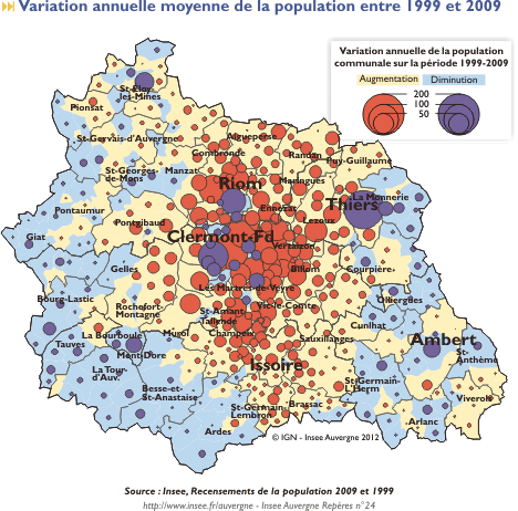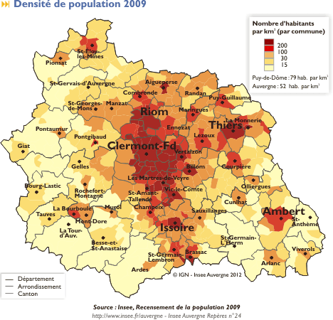 L’INSEE a publié au 1er janvier les chiffres de la population auvergnate : il s’agit des chiffres qui correspondent en fait à la population au 1er janvier 2009. On obtient la carte suivante :