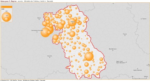 Voici deux premières cartes sur le vote Bayrou dans la 5ème circonscription du Puy de Dôme. Elles mettent en évidence la répartition des voix et les pourcentages obtenus dans chaque commune.