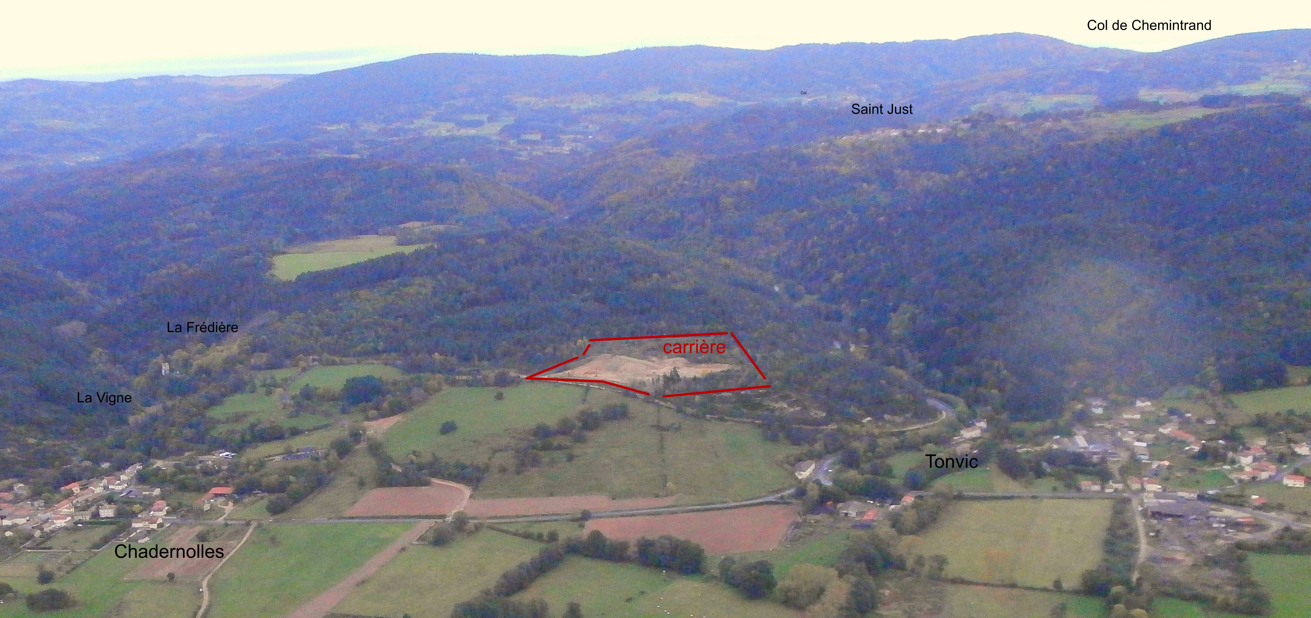 Entre Chadernolles et Tonvic, la carrière ne passe pas inaperçue… et ce n’est que le début : notez la zone déboisée à l’arrière du front de tai