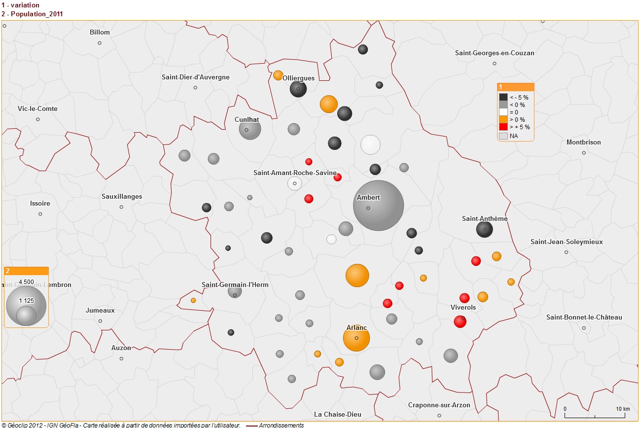 Sur l’arrondissement d’Ambert la situation est contrastée, comme le montre la carte construite avec le site http://www.geoclip.fr à partir des données de l’INSEE et présentation l’évolution de la population totale communale entre 2007 et 2011.