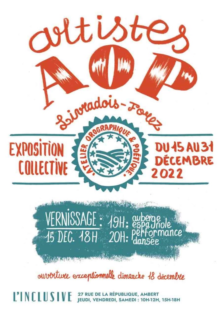 | Centre Culturel le Bief association loi 1901 depuis 2000 © Montaine Sanchez PROLONGATION Exposition EMMA RIVET Visible jusqu’au 23 DÉCEMBRE Suite aux nombreux retours très positifs, nous prolongeons l’expo d’EMMA jusqu’au 23 décembre !! Monotype, impression de végétaux sur papier Richard de Bas Rencontre avec Elsa Catelin Lundi 12 DECEMBRE à 18h Graveuse de timbre et fiduciaire, Elsa viendra vous présenter son travail, la technique du burin et fera même une démonstration. 18h – tous âges – réservation conseillée – gratuit Dans le cadre de PARLONS ESTAMPE Rencontre avec Thomas Charmont Samedi 17 DÉCEMBRE à 15h Dessinateur de WEBTOON (BD numérique), Thomas vous présentera son travail, son parcours et répondra à vos questions. 15h – tous âges – réservation conseillée – gratuit Illustration de Thomas Charmont Rencontre avec Cléa Darnaud Samedi 17 DÉCEMBRE à 17h Graveuse à l’eau-forte, Cléa vous présentera son travail ainsi que ce sur quoi elle travaille pendant sa résidence au Bief. 17h – tous âges – réservation conseillée – gratuit Spectacle entre cinéma et théâtre IT CAN BIDONE Lazzi Serpolet Théâtre SAMEDI 17 DÉCEMBRE À 19H30 À la GARE DE L’UTOPIE de VERTOLAYE Tout public – Durée 50 min – Tarif : 5 & 10€, 8€ pass médiathèqueProgrammé par la Communauté de communes Ambert Livradois Forez. Réservations au 04 73 72 39 43 / culture@ambertlivradoisforez.fr Cours du soir Eau forte Lundi 19 DÉCEMBRE de 18h30 à 20h30 Tous âges – Sur inscription Dans le cadre des cours du soir 2022/2023 ATELIERS MARDI 20 DÉCEMBRE Linogravure Cartes de Noël 14h à 17h – à partir de 8 ans – (8 participants) MERCREDI 21 DÉCEMBRE Gaufrage cartes de vœux 14h à 17h – à partir de 8 ans – (6 participants) JEUDI 22 DÉCEMBRE Linogravure cartes de vœux 14h à 17h – à partir de 8 ans – (8 participants) Tarif : 15 € / participant Le Bief OUVERTURE DE LA BOUTIQUE POUR NOËL Du mardi 20 au vendredi 23 décembre de 10h à 12h et de 14h à 18h Nos horaires d’ouverture: mercredi : 15h-18h jeudi : 10h-12h vendredi : 15h-18h Premier samedi du mois : de 10h à 12h Centre Culturel le Bief 23 rue des Chazeaux 63600 Ambert 04 73 82 16 59 – www.lebief.org contact@lebief.org |