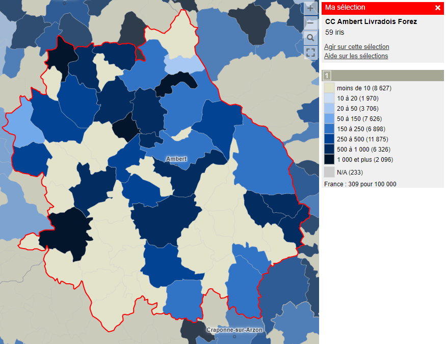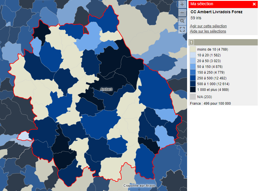 Les nombres exacts de cas positifs d’infection à SARS-CoV-2 ne sont pas rapportés du fait de contraintes réglementaires. En effet dans les petites communes ou ilots géographiques (IRS), le nombre de cas peut être limité et il n’est pas autorisé de rendre public ce type de données médicales qui pourraient être indirectement identifiantes. Cependant le classes d’incidence représentées (<10, 10-20, 20-50, 50-150 […] >1000 cas pour 100 000 habitants sur 7 jours) correspondent aux seuils pertinents pour évaluer le niveau de circulation virale. Le seuil de 50/100 000 étant celui qui peut établir qu’il existe une circulation active, celui de 250 un haut niveau de circulation. Attention à l’interprétation de ces niveaux pour les petites communes, notamment de moins de 2000 habitants. Par exemple, 1 nouveaux cas d’infection à SARS-CoV-2 en une semaine sur une commune de 2000 habitants donne une incidence de 50/100 000 sur la commune, 3 cas de 150, etc.