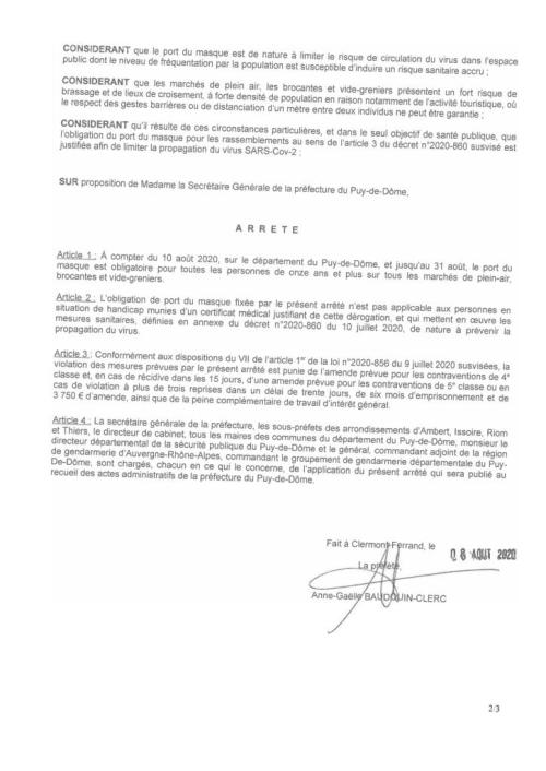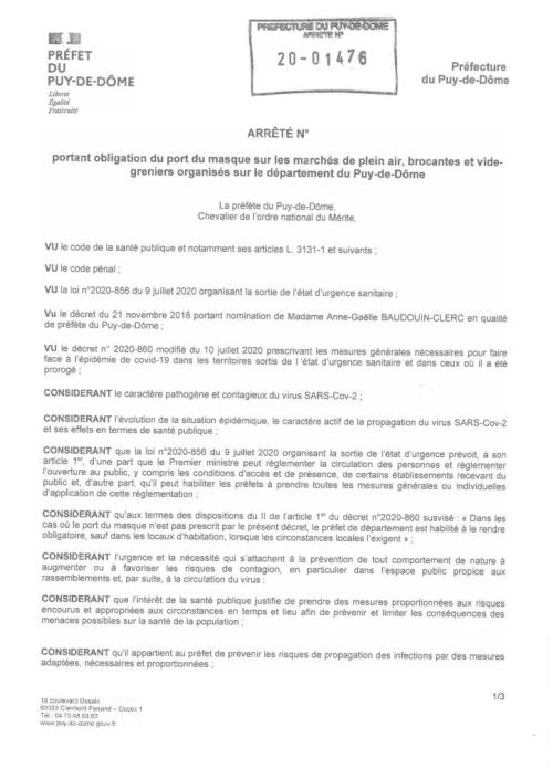 Covid19 : port du masque obligatoire sur les marchés, brocantes et vide-grenier du Puy de Dôme à partir du lundi 10 août 2020.
